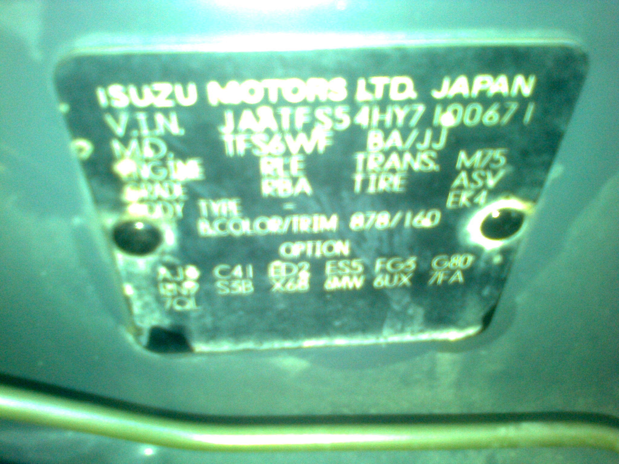 219CXR Postat Septembrie 11, 2014 Partajează Postat Septembrie 11, 2014 Re: Frontera 2.5 tds Daca te ajuta cu ceva (si daca am vazut eu bine VIN-ul din pozele atasate), ai datele de mai jos pentru aceasta masina: Engine Type:2.5TD Engine Serial Number:671209 Body Style: TFS Fabrication Number: Date Code:07101999 Transmission Number: Trim Combination Code: GM*Drive Code:XXUD Drive Filter:LHD VIN Decode: JAA:Isuzu T:Pick Up F: 1 TON S:4X4 54:2.5 TD H:Long Wheelbase Y:2000 7100671:SERIAL NUMBER No. Code Option 1 2G4 4-WHEEL DRIVE 2 85U KEIZER SILVER METALLIC 3 A95 ST. BUCKET WITH H/REST & RECL. 4 B30 CARPET MATS 5 C49 REAR WINDOW-DEFOGGER 6 C72 MAP LAMP 7 CT2 AUSTRIA-MANDATORY 8 E28 GRIP ASSIST 9 FG3 HEAVY DUTY SHOCK ABSORBER 10 G86 LIMITED SLIP DIFFERENTIAL 11 LHD LEFT HAND DRIVE 12 LP0 ENG-4 CYL 2.5L OHV T/DIESEL 13 MM5 TRANS-MAN 5-SPEED 14 N33 STEERING COLUMN-TILTABLE 15 N3E PROV.-SP.WHEEL ADDITIONAL MNTG 16 NY1 SHIELD FUEL TANK 17 NY9 SHIELD RADIATOR LOWER 18 QWC TIRES 205/80R REINF T RANGE 19 R4W TIRE MANUFACTURER MICHELIN 20 T79 FOG LAMP REAR 21 TT5 HALOGEN H/LAMP-BULB TYPE 22 U16 REVOLUTION COUNTER 23 U93 ANTENNA - MANUAL RETRACTABLE 24 U95 2 LOUDSPEAKERS IN DOORS 25 UE8 CLOCK DIGITAL 26 VH4 MUD FLAPS FT/RR 27 VP0 HOOK TOW CLOSED TYPE 28 VWN HOOK TOW REAR BOLT ON 29 WE4 SIDE IMPACT BAR 30 X6W HUB LOCKING MANUAL 31 XXUD INTERIOR TRIM-GREY CLOTH(A 0724066100 Link spre comentariu Distribuie pe alte site-uri Alte opțiuni partajare...
