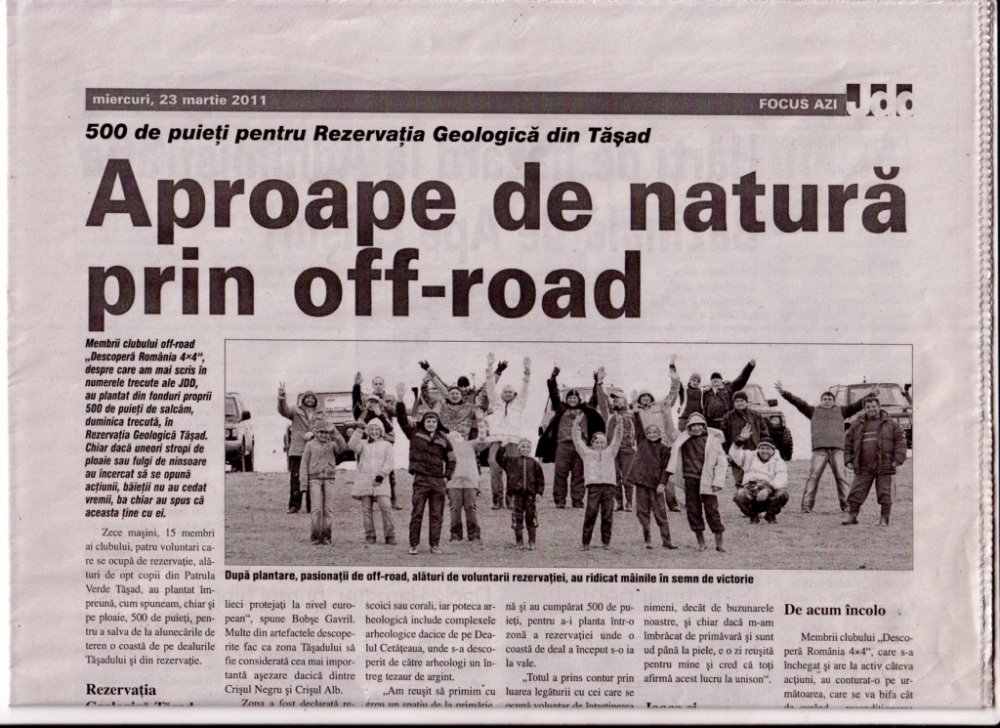 ted Postat Martie 8, 2011 Partajează Postat Martie 8, 2011 (editat) Propun o iesire cu un scop ecologic, si anume plantare de puieti (copaci) in Tasad, care de fapt este o rezervatie ecologica. Ar fi nevoie de aprox. 1000 de puieti pe care ii putem achizitiona din Sacuieni (maxim 300 ron). Am luat legatura cu administratorul rezervatiei D-nul Bobse Gavril (tata lui Narcis) care ne pune la dispozitie uneltele necesare, ne va surprinde cu un traseu frumos de off road care se va incheia cu o masa campeneasca . Acestea fiind spuse si in speranta ca ne vom strange cat mai multi, noi va asteptam cu drag pentru a petrece o zi frumoasa in natura DUMINICA 20.03.2011. Pana acum s-au anuntat urmatorii: Ionut (ted)-Samurai Cipri (Mitsubishi) Radu (Defender) Coco (Patrol) Florin (Vitara) ..... lista este deschisa Editat Martie 9, 2011 de Max Link spre comentariu Distribuie pe alte site-uri Alte opțiuni partajare...