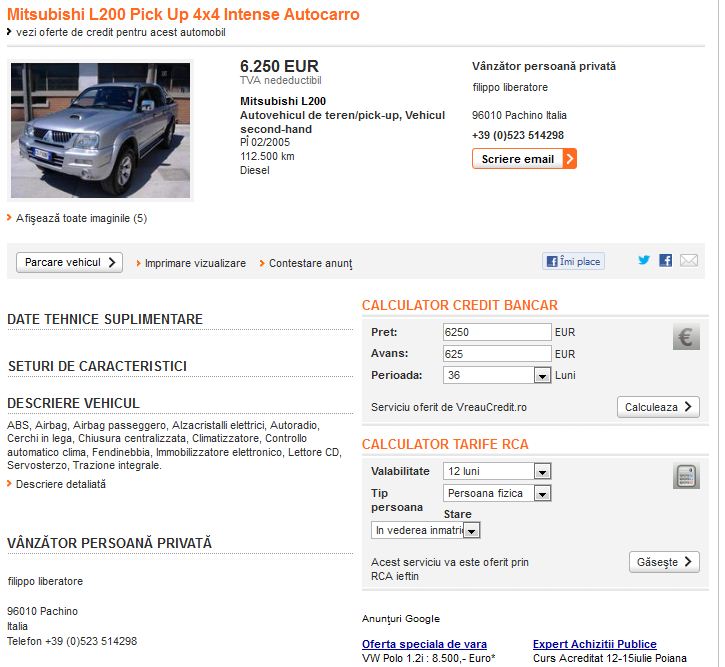 bbs Postat Iulie 1, 2012 Partajează Postat Iulie 1, 2012 (editat) am gasit o masina pe mobile.de, cu 5-6 sute de euro mai ieftina decat in mod normal. Am sunat, era un italian, nu a raspuns. I-am dat e-mail, si mi-a raspuns ca el e in Anglia cu tot cu masina, si daca vreau mi-o trimite cu un curier. Imi lasa masina 5 zile sa o probez, testez. La primirea masinii ii dau 50 % din pret, apoi dupa 5 zile ii dau restul. Eu ma gandesc sa fac altfel: sa ii fac un test in service, sa ii fac Rar-ul in aceeasi zi (sa nu fie facuta din bucati-serii diferite), sa nu am pb cu inmaricularea, si daca totul e ok, sa ii dau toti banii. Voi ce spuneti? asta e masina: http://cautare.mobile.ro/automobile-anunturi/mitsubishi-l200-pick-up-4x4-intense-autocarro-pachino/163421094.html?useCase=SearchSession&lang=ro&pageNumber=1&scopeId=C&sortOption.sortBy=price.consumerGrossEuro&makeModelVariant1.makeId=17700&makeModelVariant1.modelId=13&makeModelVariant1.searchInFreetext=false&makeModelVariant2.searchInFreetext=false&makeModelVariant3.searchInFreetext=false&fuels=DIESEL&siteId=ROMANIA&negativeFeatures=EXPORT&minConstructionYear=2004&tabNumber=1 Editat Iulie 1, 2012 de Astral Link spre comentariu Distribuie pe alte site-uri Alte opțiuni partajare...