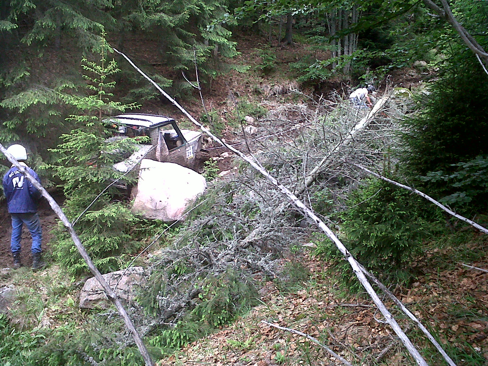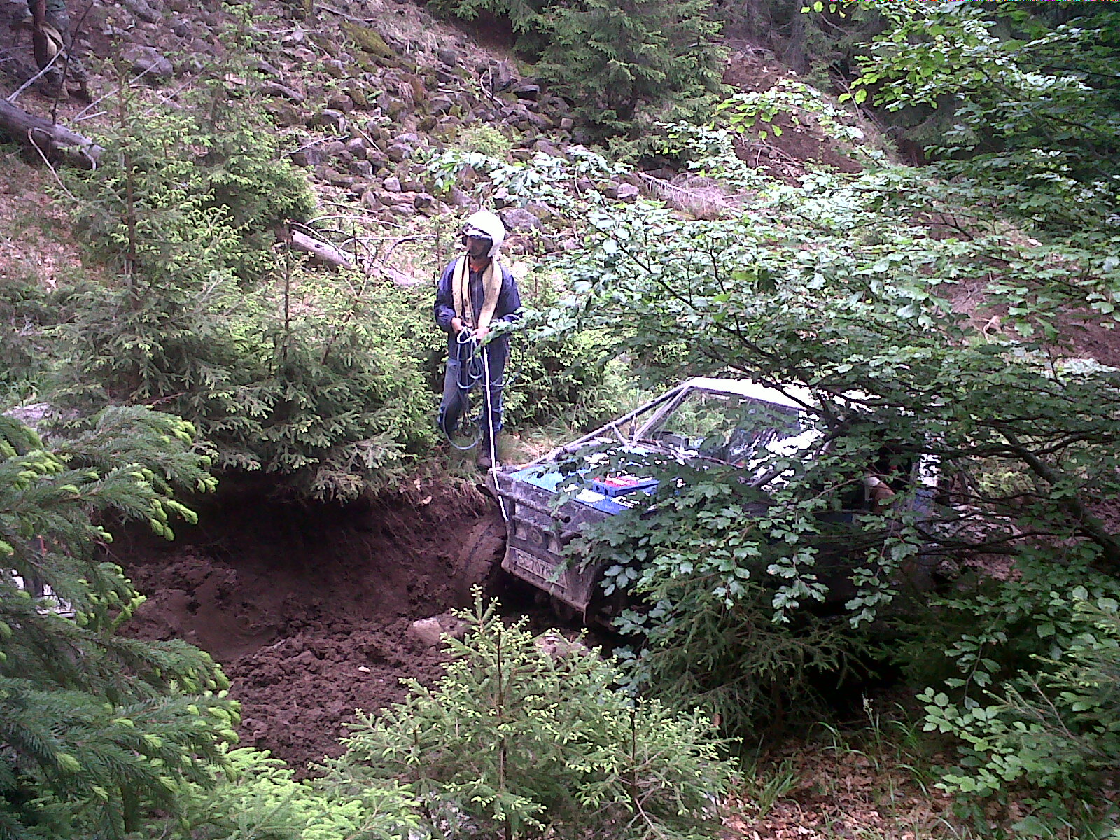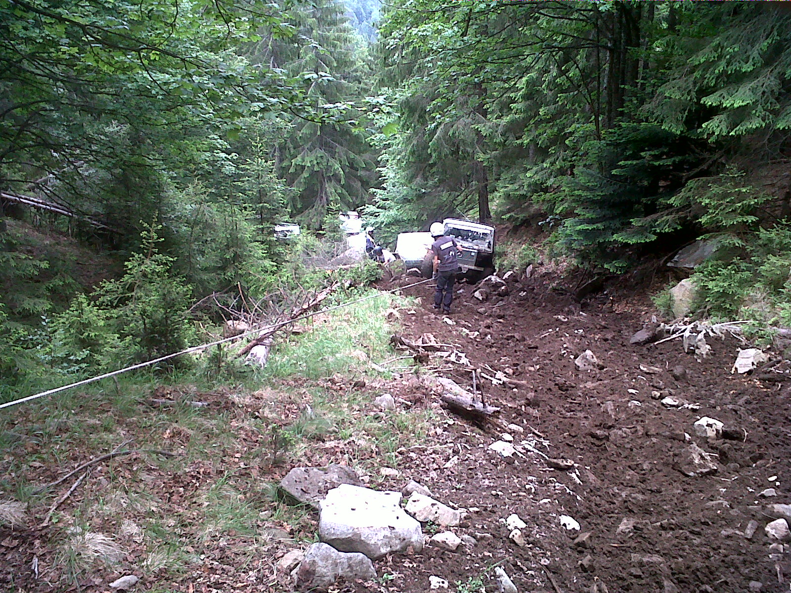 Era prima zi la pozitia 15 cu CP!! se vede cp ul la inceputul filmului pe dreapta sus! Acesta se afla "pe partea dreapta la vreo 1.5 m inaltime spre masina" adica pe stanga la vreo 3 metri inaltime, si cei care nu s-au oprit sa astepte dupa careva nu l-au luat!! :uameni. Noi aicea am rupt troliul din suport, ne-am blocat intre doua bolovani ne a prins si ploaia, am pierdut 4 ore dar cu troliul legat cu sufa si lant am terminat aproape tot concursul cu masina intreaga!!!A fost extrem de openos sau open extremos? In orice caz noi cei care am pornit ultimii am prins niste ploi pe traseu si ne-am troliat in total vreo 1500 metri cu troliul nostru chinezesc adica melcul cel fortos.